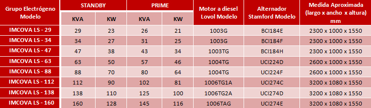 El rango de capacidades disponibles va desde 29KVA / 23KW hasta 160KVA / 128KW.